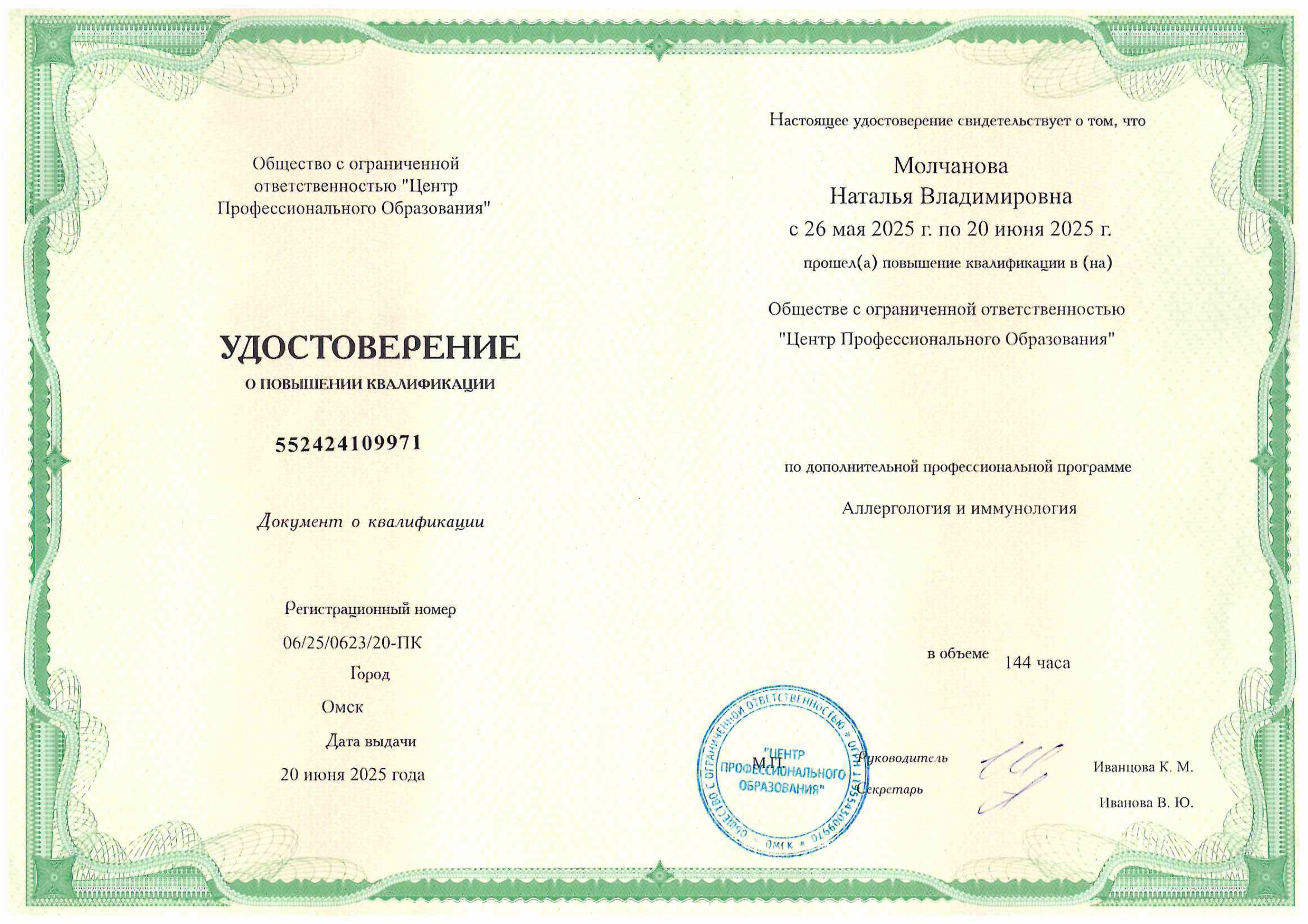 - 2025 г. - повышение квалификации «Аллергология и иммунология» Центр профессионального образования г. Омск